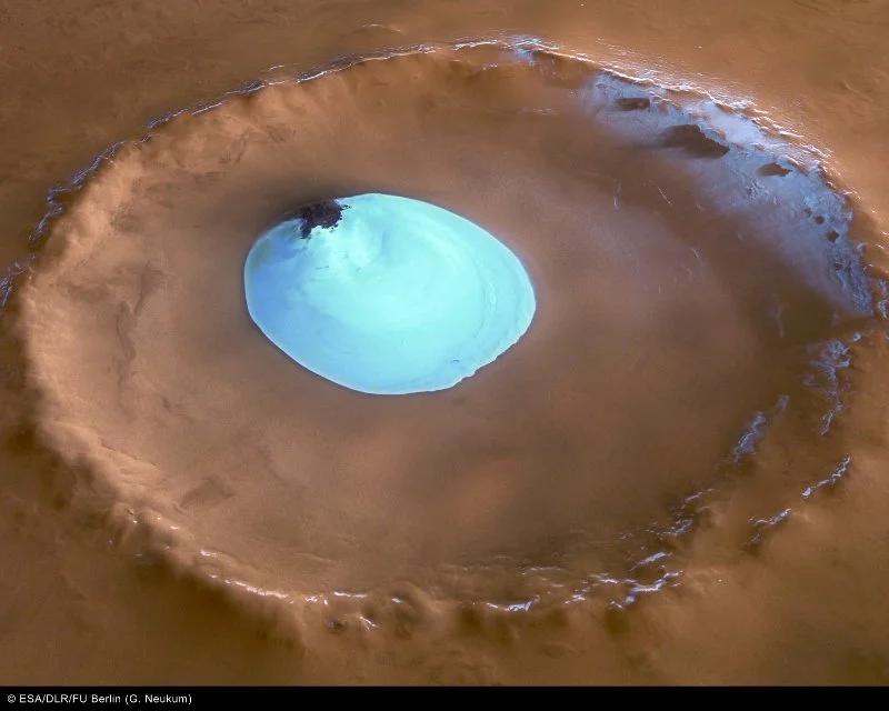 Hielo de H2O en el interior de un cráter, tomado por Mars Express. Versión a 6000x4800 px. Crédito: ESA.