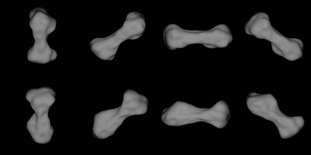 216 Kleopatra, un asteroide metálico de 217 km de longitud. Imagen obtenida por pulsos de radar del Observatorio de Arecibo.
