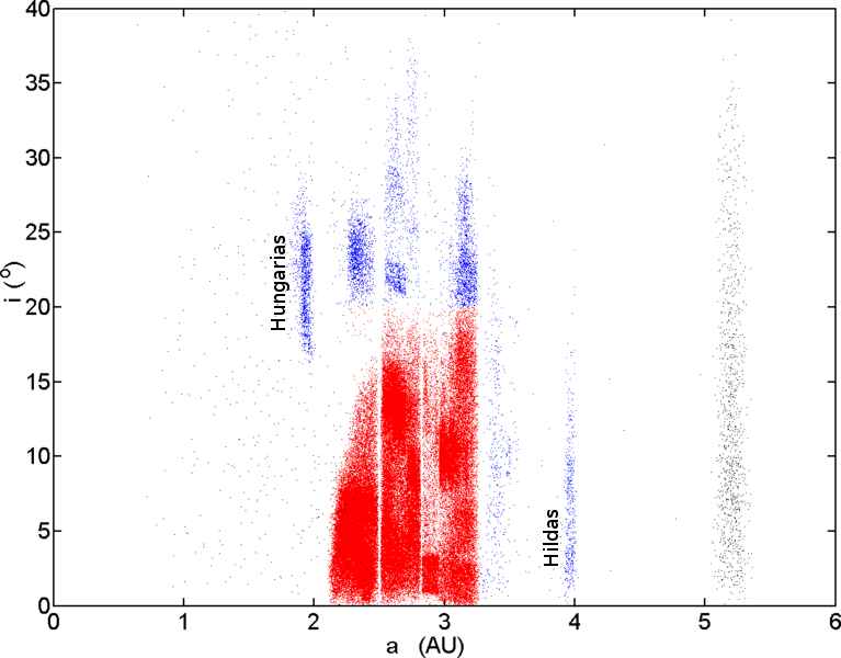 Algunas familias ni siquiera están dentro del Cinturón propiamente dicho, pero quiero hablar de ellas también aquí porque se trata de objetos suficientemente parecidos como para incluirlos en este artículo. Las Hungarias están más cerca del Sol que los asteroides “centrales”, más cerca que el hueco de Kirkwood 4:1. Están tan cerca de Marte que la influencia gravitatoria de ese planeta, por pequeño que sea, fue vaciando esa banda hasta no dejar nada… excepto aquellas rocas que estaban orbitando con inclinaciones muy grandes. Si te fijas en la gráfica distancia-inclinación al final del párrafo, puedes ver los asteroides de esta familia a la izquierda en azul, a unas 2 UA del Sol. Como puedes ver, al contrario que más lejos de la estrella, no hay asteroides en rojo con poca inclinación – Marte los ha “deshauciado” a todos a lo largo del tiempo, y las Hungarias se han salvado sólo por estar tan alejadas del plano de la órbita de Marte que su influencia gravitatoria no ha logrado perturbar sus órbitas. Se trata de asteroides muy pequeños; el más grande de todos y que da nombre a la familia, 434 Hungaria, tiene sólo 20 km de diámetro.