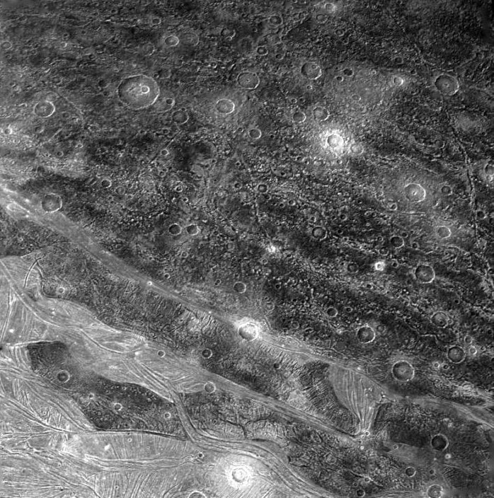 Cuando las dos Voyager alcanzaron el sistema joviano, nos proporcionaron por fin las primeras imágenes de buena calidad de Ganímedes, revelando una luna bastante más compleja de lo que sospechábamos –y aún no habíamos descubierto las sorpresas más gordas–:
