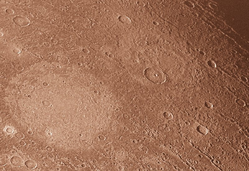 Pero ¿qué procesos pueden haber renovado la superficie ganimedeana? En esta época de su vida, nada puede producir el calor interno necesario para ello… pero hace unos cuantos cientos de millones de años sí. La densidad de cráteres sobre las regiones sugiere que son tan antiguas como el propio Ganímedes –casi tan antiguo como el Sistema Solar–, pero los surcos pueden tener algo menos de mil millones de años, jóvenes comparativamente, pero suficientemente antiguos para haberse formado durante una época en la que Ganímedes aún tenía una órbita más elíptica y, por tanto, calentamiento interno por deformación gravitatoria. No estamos seguros de ello, pero la explicación no tiene mala pinta.