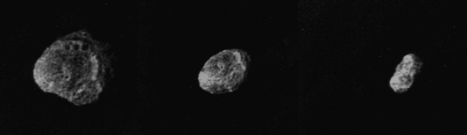 A diferencia de los últimos satélites de los que hemos hablado, todos ellos lo suficientemente grandes como para que su propia gravedad les dé forma esférica, las Voyager nos revelaron un Hiperión en forma de patata, en absoluto esférico. Dado que Voyager 2 se acercó a tan sólo unos cuantos cientos de miles de kilómetros de la luna, pudo tomar fotografías desde distintos ángulos, lo cual dejó clarísimo que Hiperión tenía una forma muy irregular.
