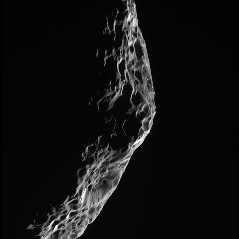 Pero Voyager 2 descubrió algo realmente inusual en Hiperión, especialmente teniendo en cuenta que orbita un objeto gigantesco: su rotación es caótica. Esto se puso de manifiesto al principio por el hecho de que Hiperión es oscuro por todas partes: tiene un albedo de 0,3, es decir, refleja tan sólo el 30% de la luz que recibe. Dado que casi todos los satélites de estas regiones exteriores del Sistema Solar tienen grandes cantidades de hielo (tanto de H2O como de CO2), esto suele suceder simplemente porque se han ensuciado con partículas que se han ido depositando sobre su superficie.