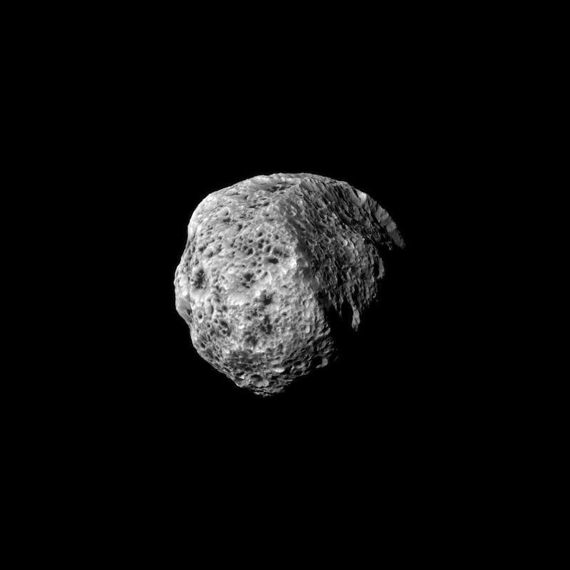 Como puedes ver en la imagen, Hiperión es un satélite que no alcanza el tamaño necesario para tomar forma esférica por su propia gravedad. Sin embargo, es lo suficientemente grande –y está lo suficientemente lejos de Saturno– como para que lo descubriésemos relativamente pronto, aún en el siglo XIX.