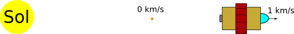 Supongamos que nuestra nave se está alejando del Sol a una velocidad de, por ejemplo, 1 km/s, y que queremos acelerar para alcanzar una mayor velocidad. Nuestro cañón dispara arena hacia el Sol a una velocidad determinada respecto a la nave, de modo que parte de la energía empleada por el cañón se la queda la arena, y parte se la queda la nave. Pero ¿cuánta se queda cada una?
