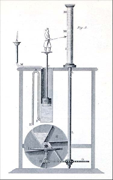 Como ves en el cilindro, hay dos grupos de doce horas marcados en él. Por tanto, según la figura sube hasta arriba al llenarse el depósito, marca todas las horas del día. Pero fíjate en el fino tubo a la izquierda del principal, marcado como F B E. Según el agua llena el depósito, también asciende por ese tubito, lo cual no significa mucho… hasta que el agua llena completamente el depósito. En ese momento, la figura está marcando la hora XII del segundo grupo (es decir, ha marcado desde abajo hasta arriba las 24 horas del día)… y en ese instante el agua cae por el tubo en forma de sifón sobre la rueda que hay debajo. Como la boca F está en el fondo del depósito, por el efecto de vasos comunicantes el depósito se vaciará completamente por el sifón, y el agua que lo llenaba caerá en la rueda.